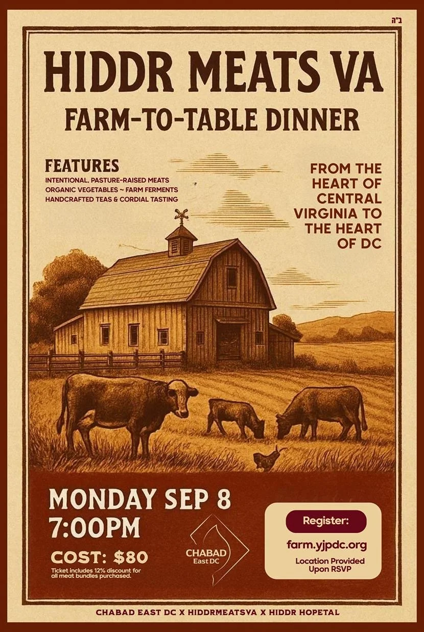Join us for an intimate kosher 3 course farm-to-table dinner experience featuring Star-K certified, pasture-raised meats, organic vegetables, farm ferments, and handcrafted teas with a cordial tasting. From the heart of Central Virginia to the heart of DC, this evening is rooted in rethinking kosher hospitality and celebrating the land that nourishes us.