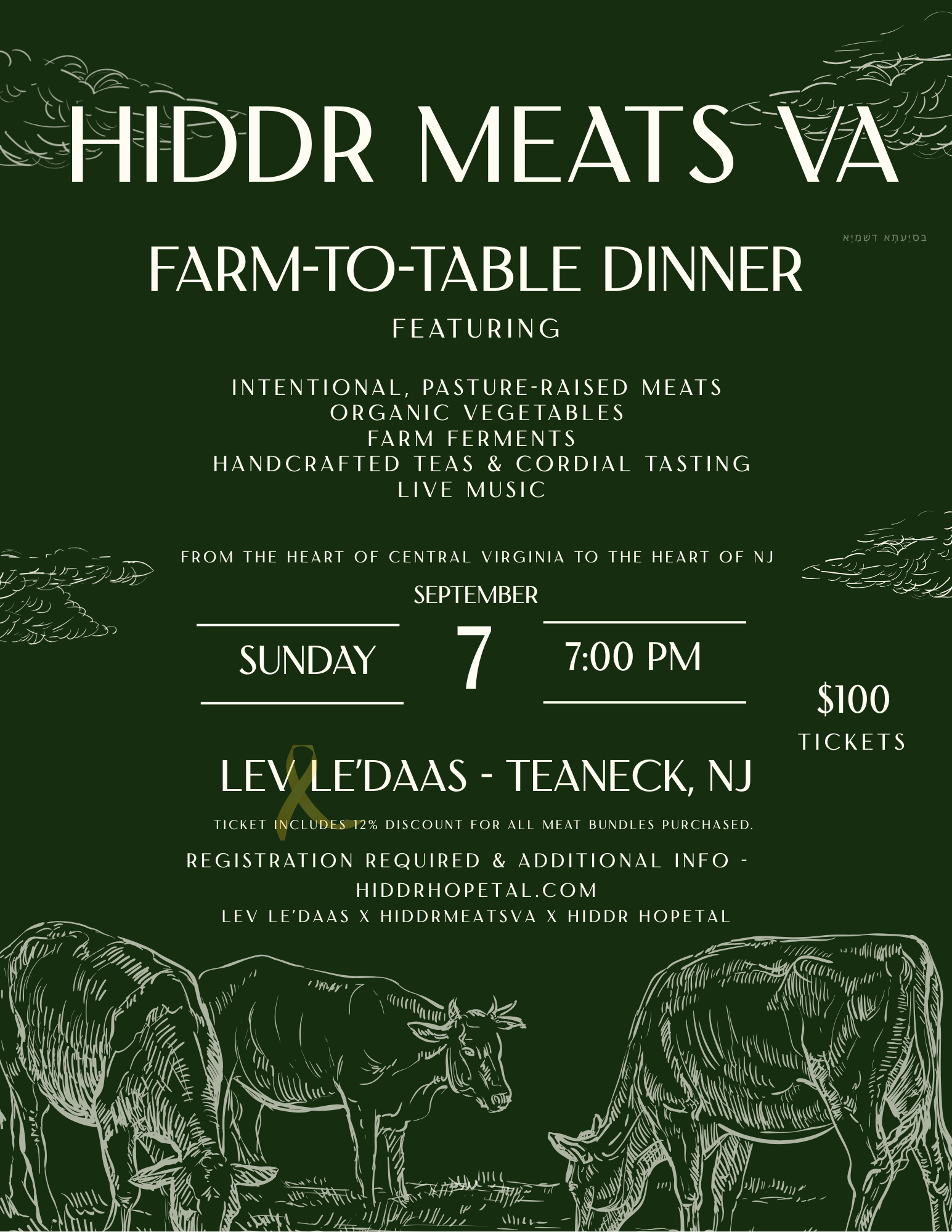 Join us for an intimate 3 course kosher farm-to-table dining in Teaneck, NJ, hosted at Lev Le’Daas. This dinner will feature Star-K certified, pasture-raised meats, organic vegetables, farm ferments, handcrafted teas with a cordial tasting, and live music. From the heart of Central Virginia to the heart of NJ, we’re bringing you a curated experience rooted in tradition and community.